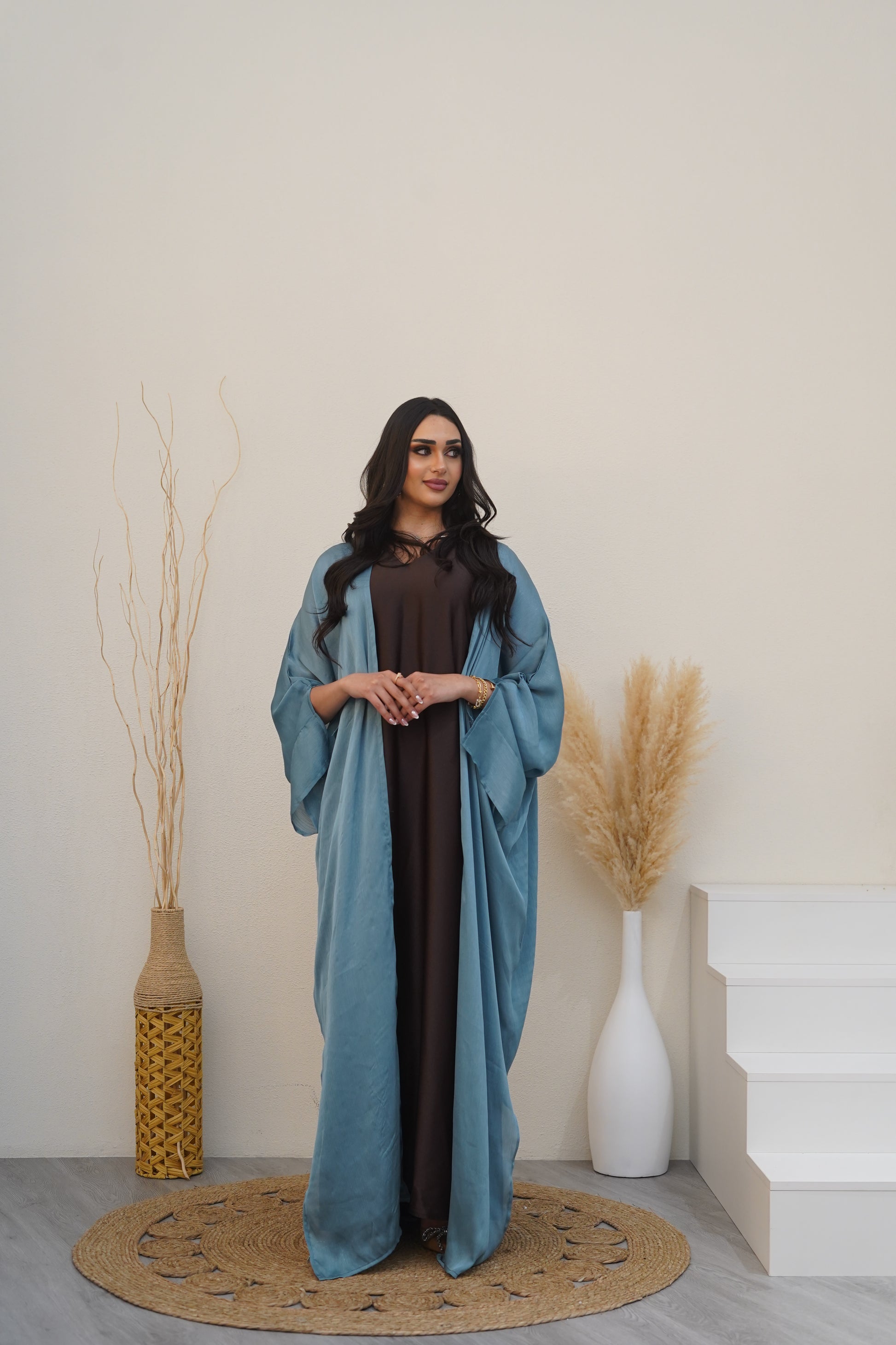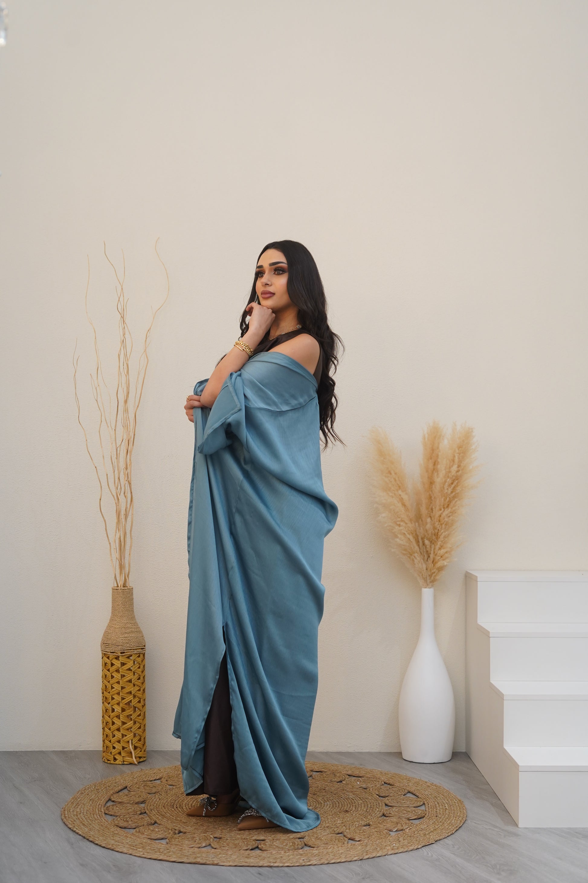 This elegant blue bisht, paired with a rich brown dress, strikes the perfect balance between sophistication and modern style. Its flowing design makes it ideal for any occasion. Dry clean only.