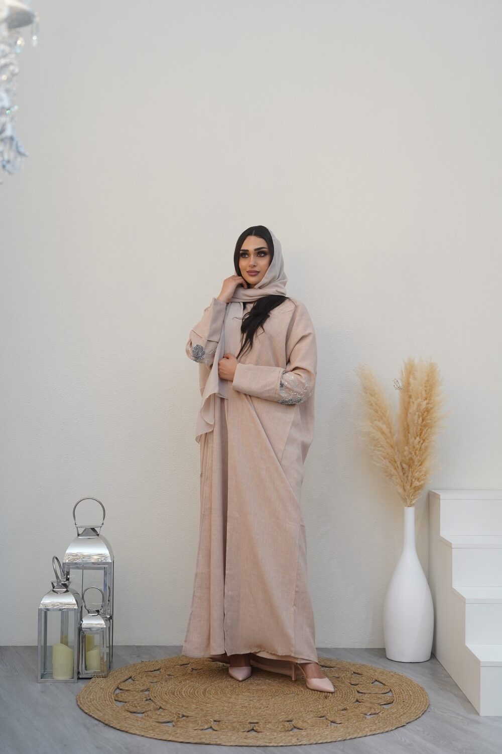 This elegant beige abaya features delicate embroidery on the sleeves, paired with a