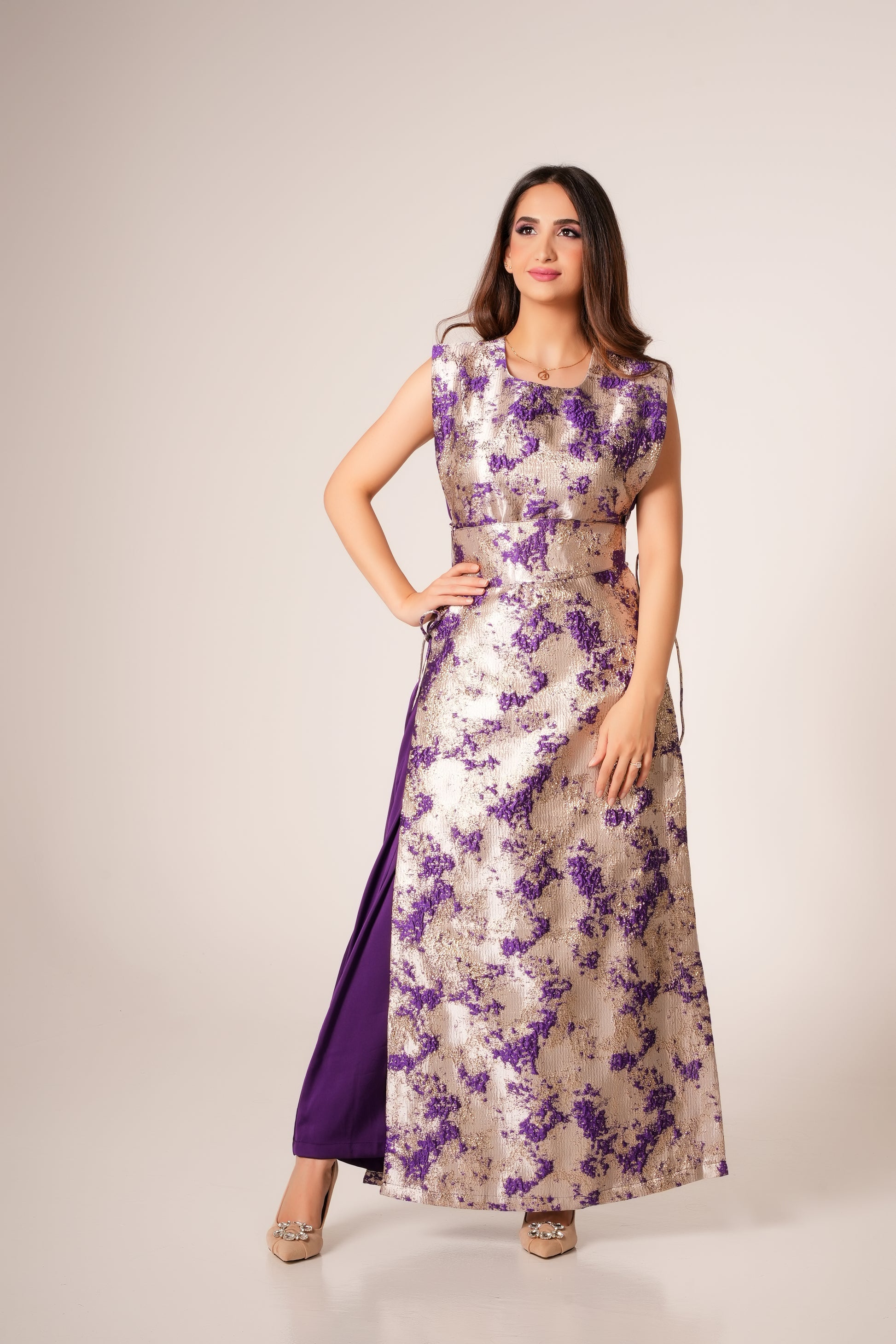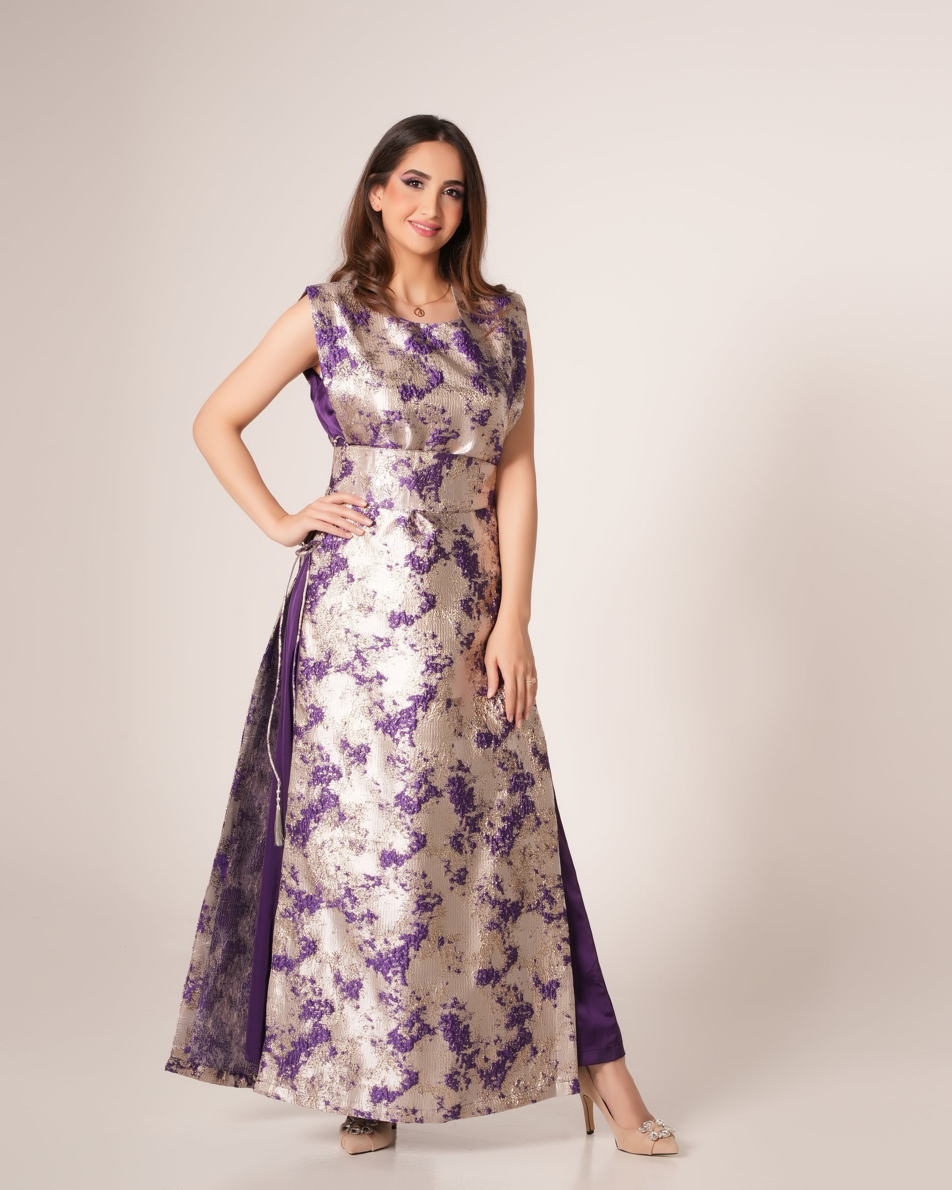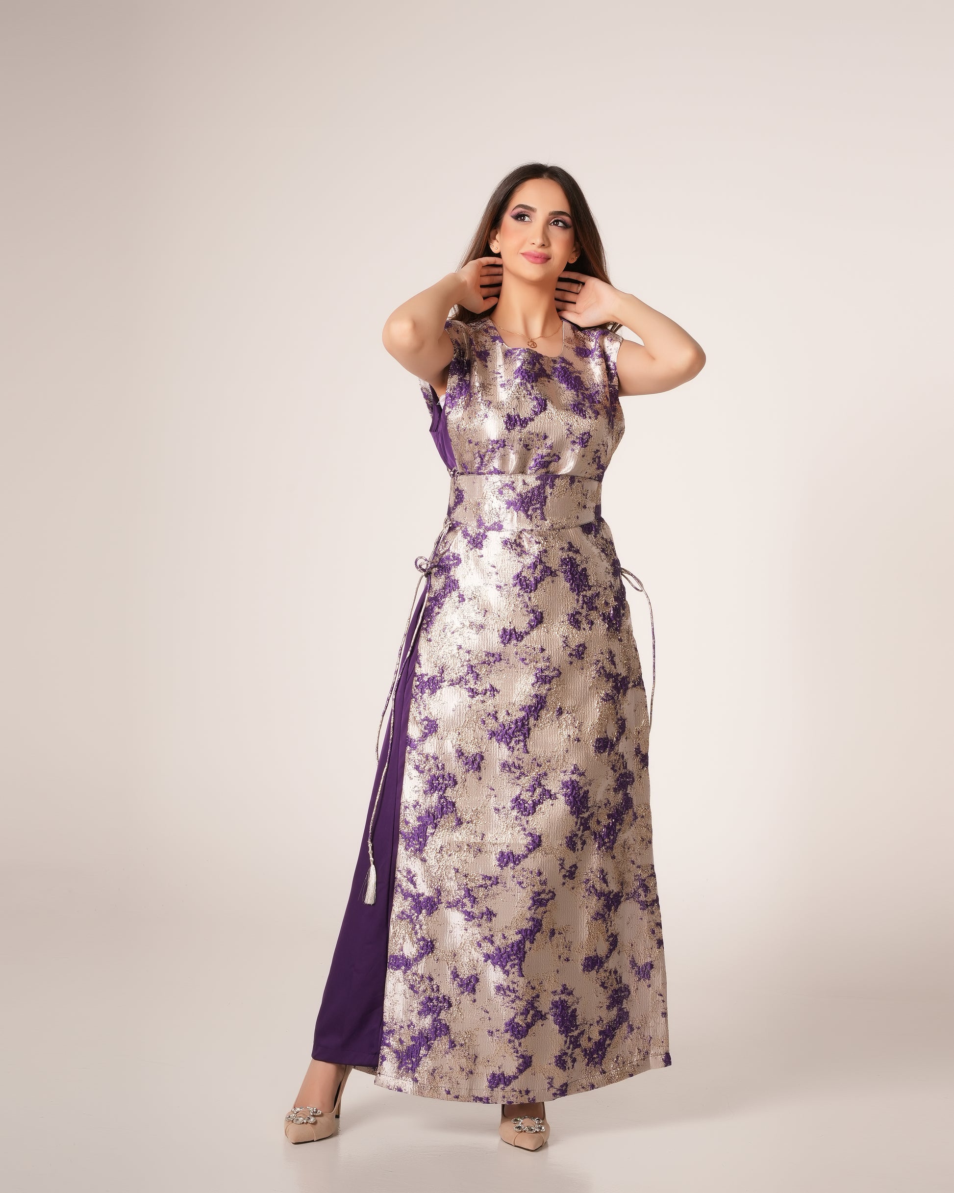 Exude elegance in this sleeveless purple kaftan dress, crafted from rich brocade fabric with a luxurious satin finish. The intricate patterns add a touch of royalty, while the flowing silhouette ensures effortless grace. Perfect for special occasions and timeless sophistication.