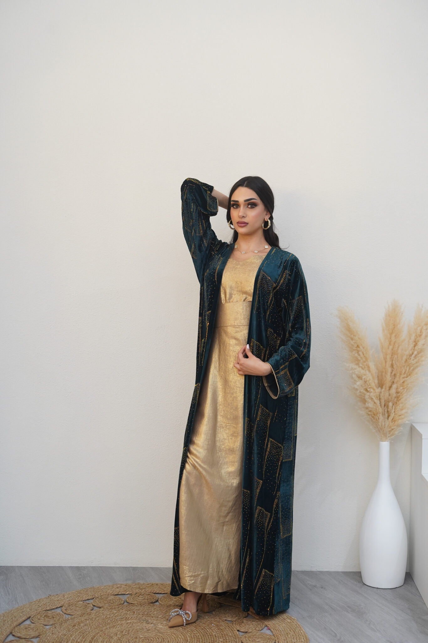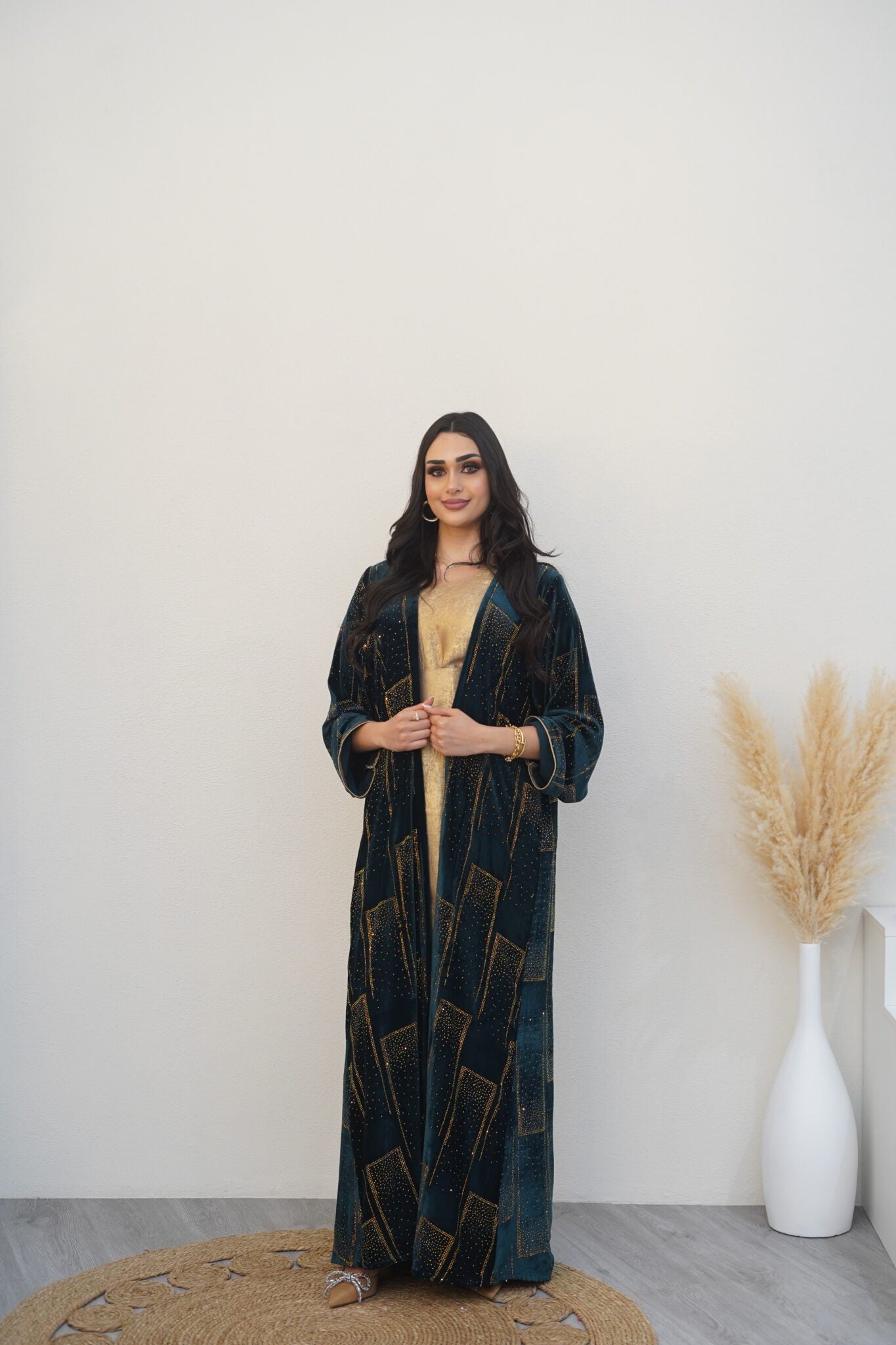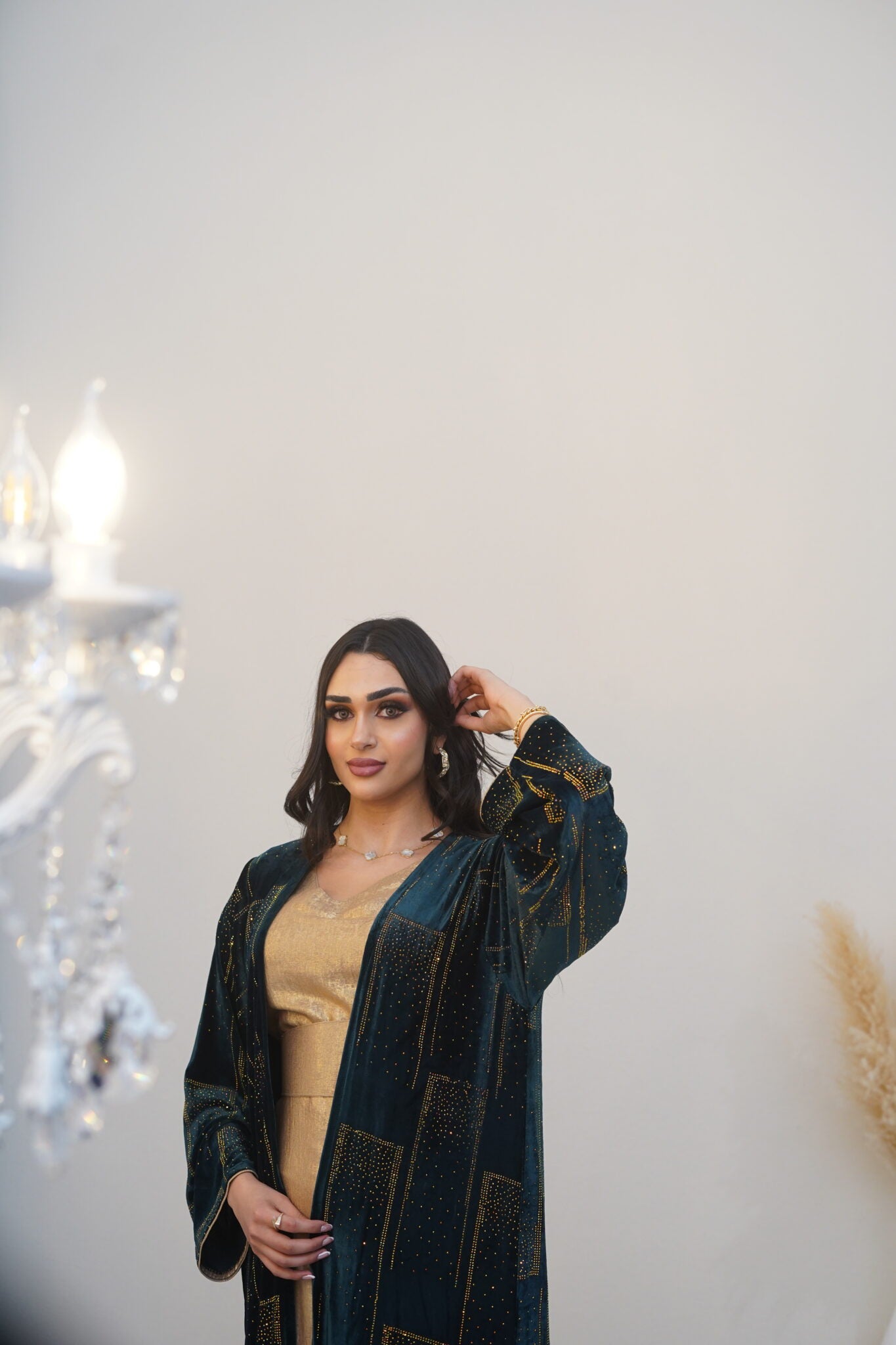 This exquisite dark green velvet kaftan, adorned with sparkling Swarovski crystals, pairs beautifully with a radiant golden dress. A perfect blend of luxury and elegance, it’s an ideal choice for Ramadan nights. Dry clean only