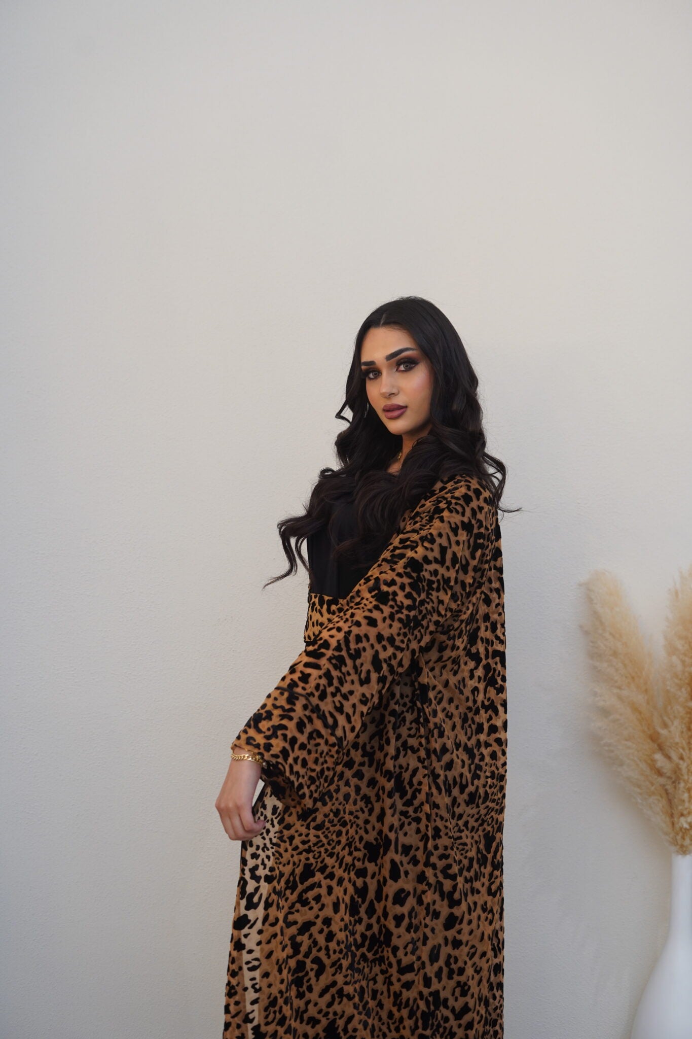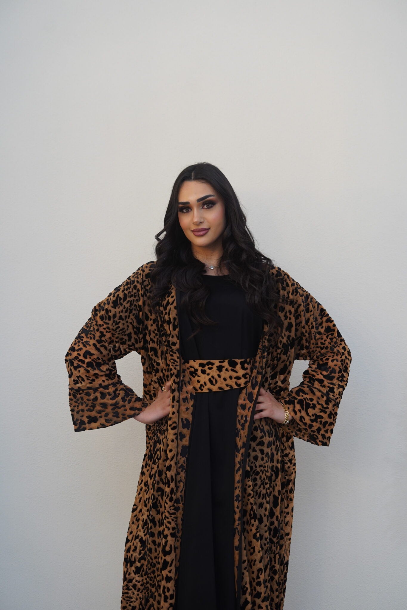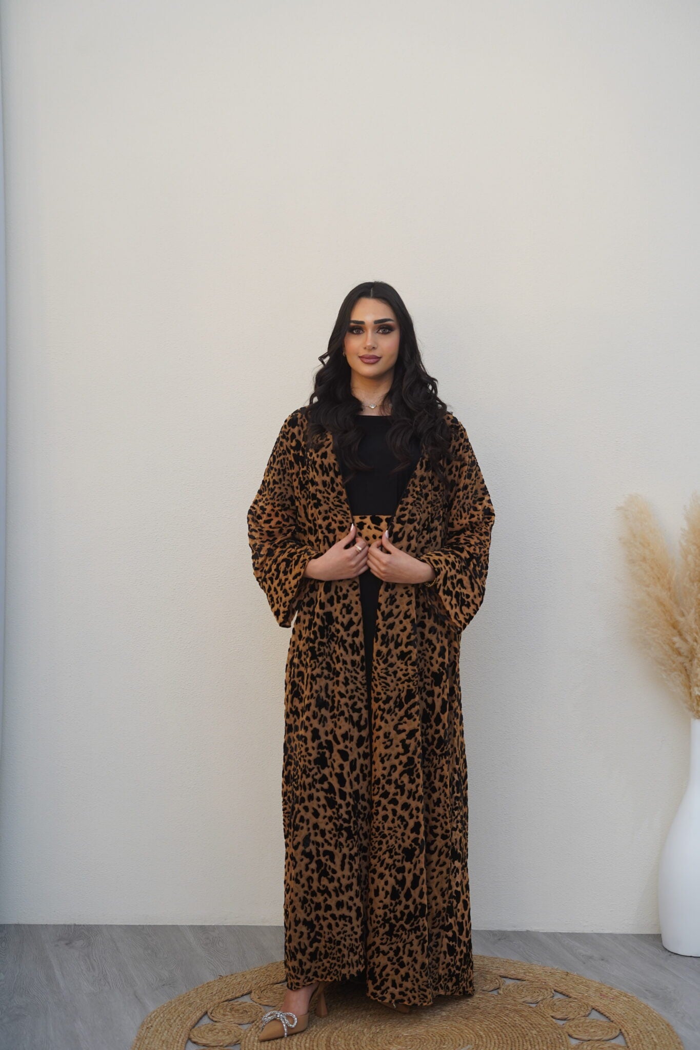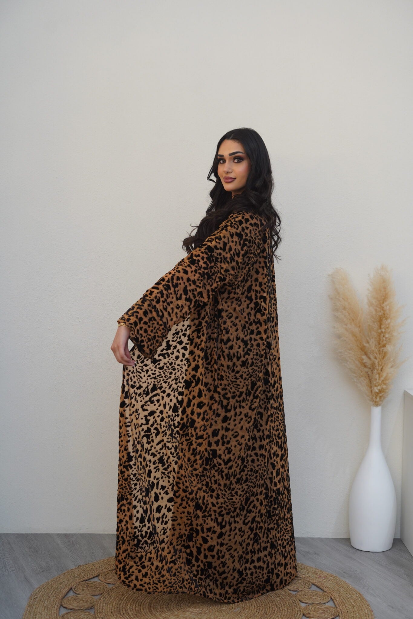 This striking brown and black tiger-print kaftan is a perfect blend of boldness and elegance. Its flowing silhouette makes it an ideal choice for Ramadan evenings and beyond. Dry clean only