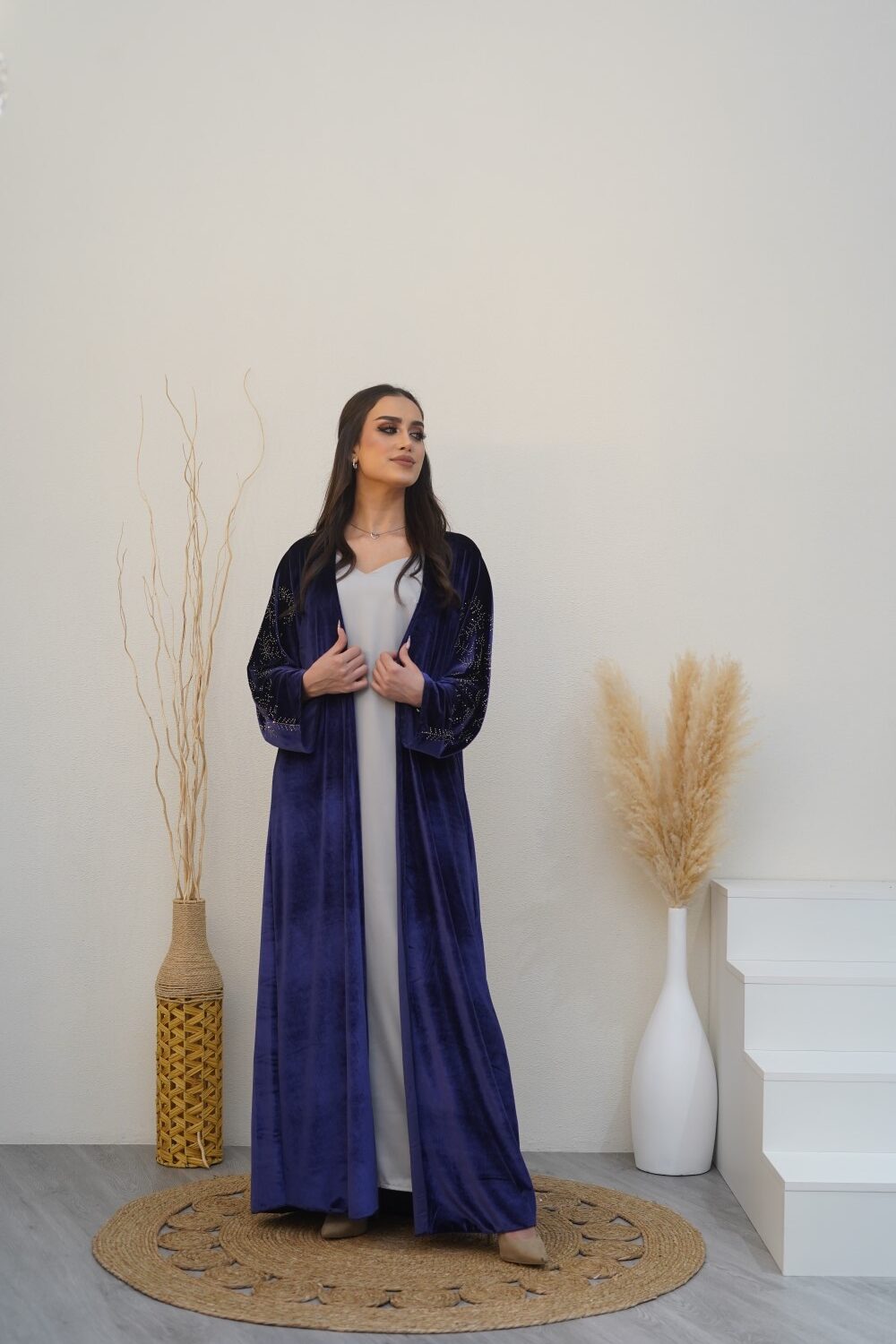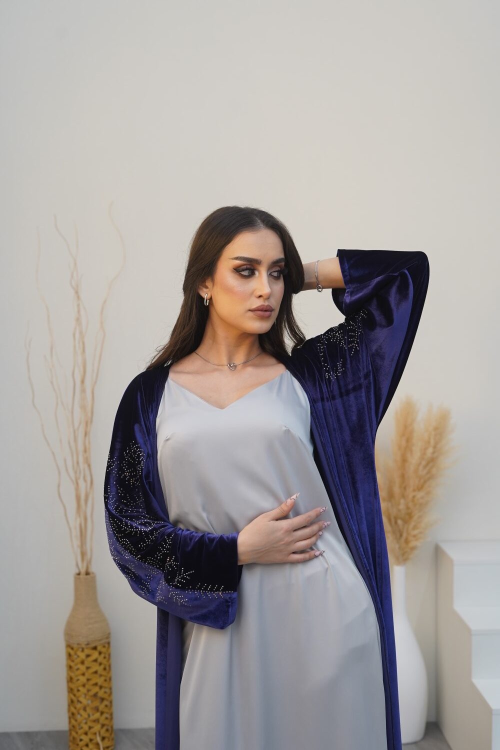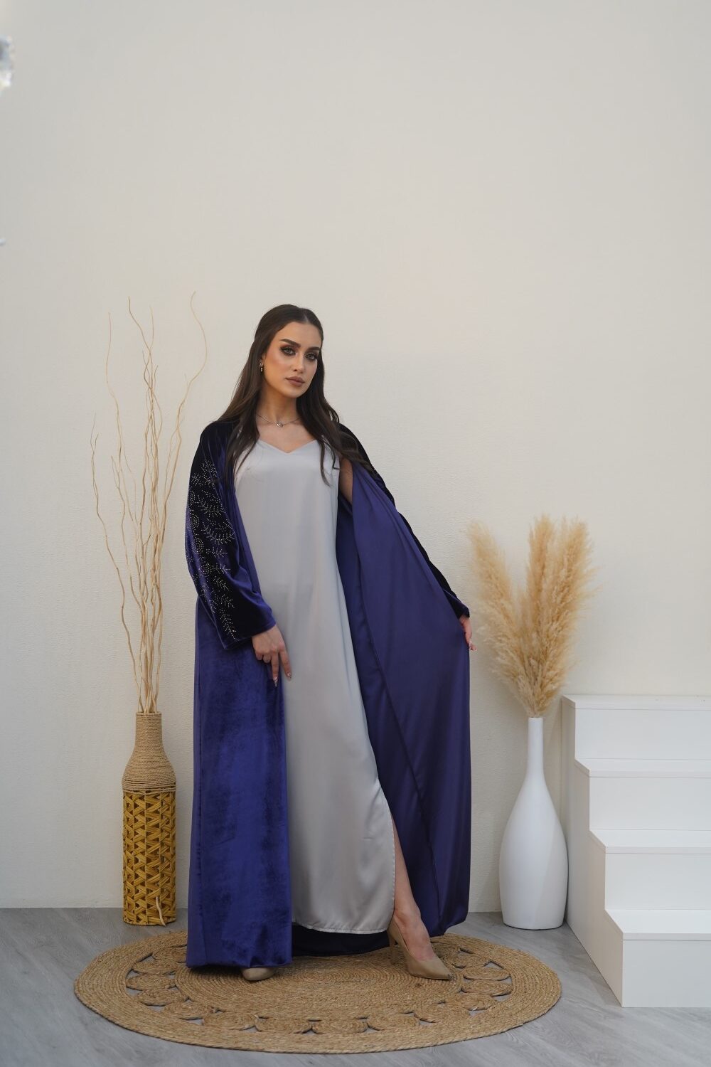 This elegant purple velvet abaya, paired with a silver silk dress, strikes the perfect balance between sophistication and modern style. Its flowing design makes it ideal for any occasion. Dry clean only.