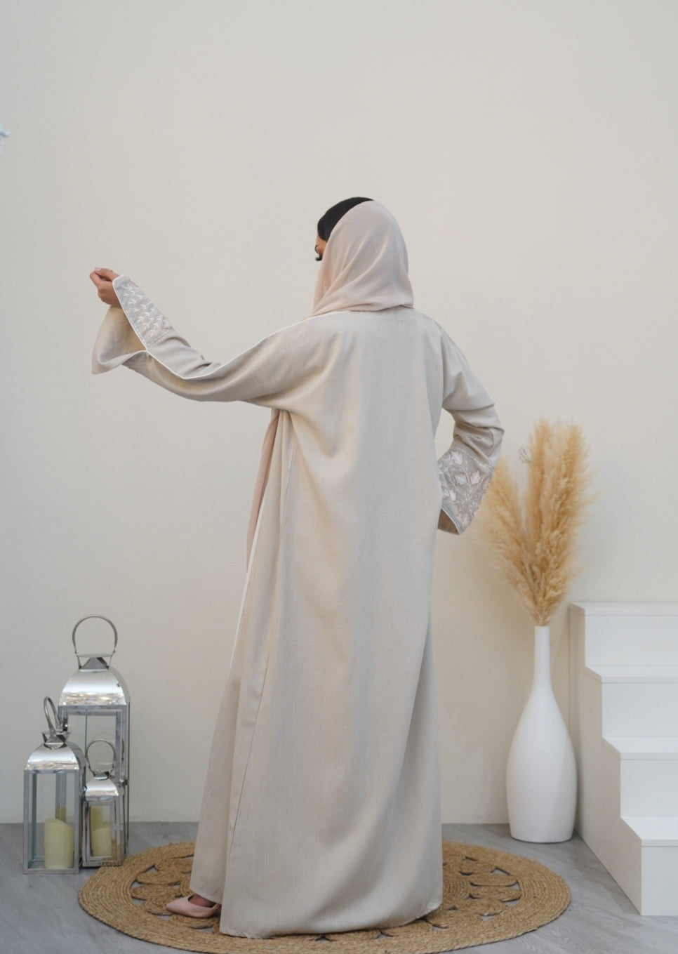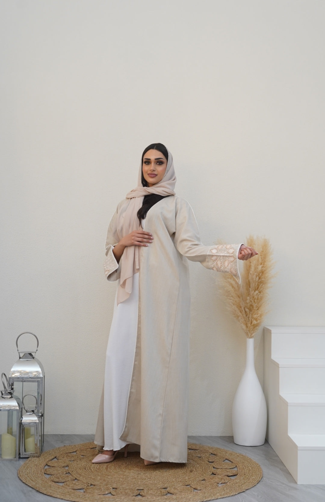 This exquisite off-white abaya features intricate embroidery on the sleeves, paired with a matching dress for an effortlessly elegant look. Designed with a perfect balance of style and comfort, it’s ideal for any occasion. Dry clean only.